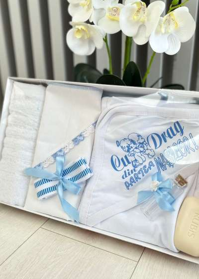 Setul contine : prosop baie, prosop preot, fasa, panza mir, pled bbc, sticluta ulei.