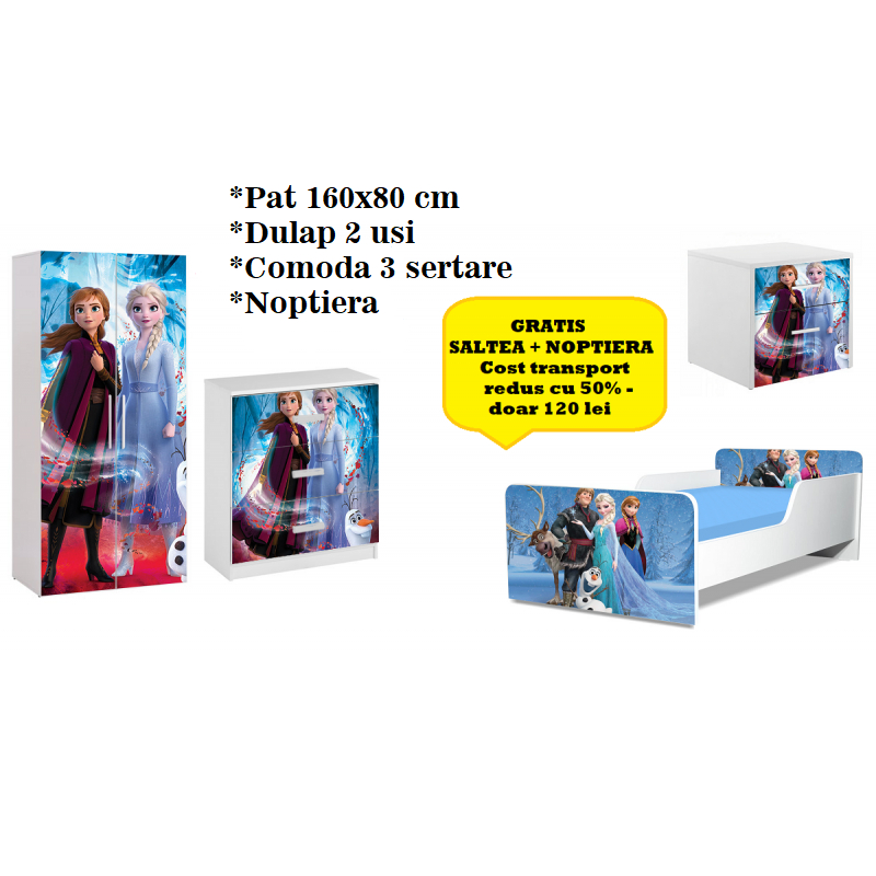 SET DORMITOR FROZEN, PAT 160X80, DULAP 2 USI, COMODA, NOPTIERA 160*80 CM